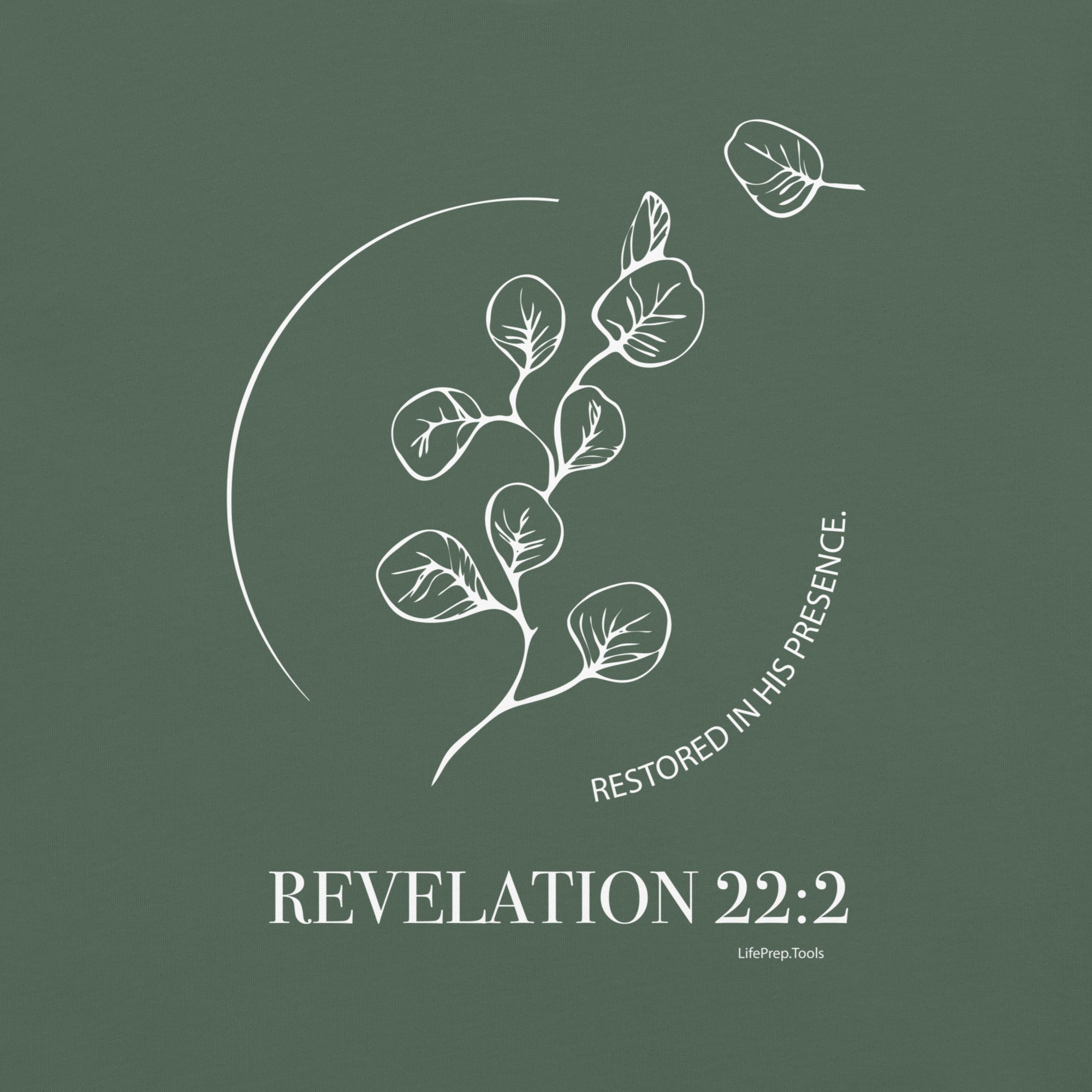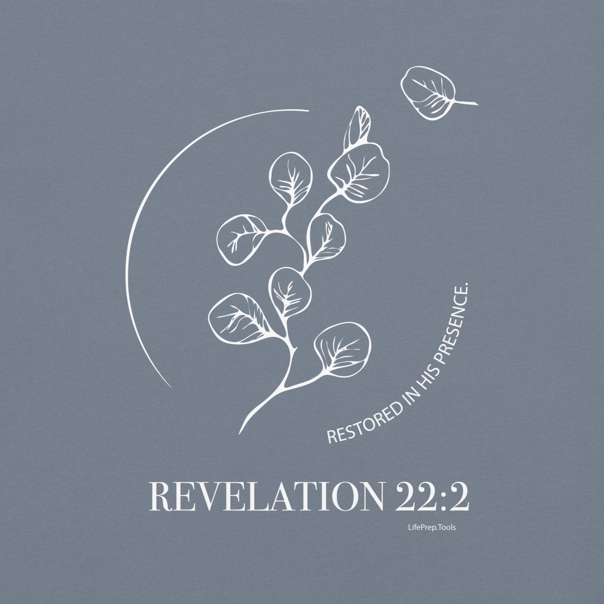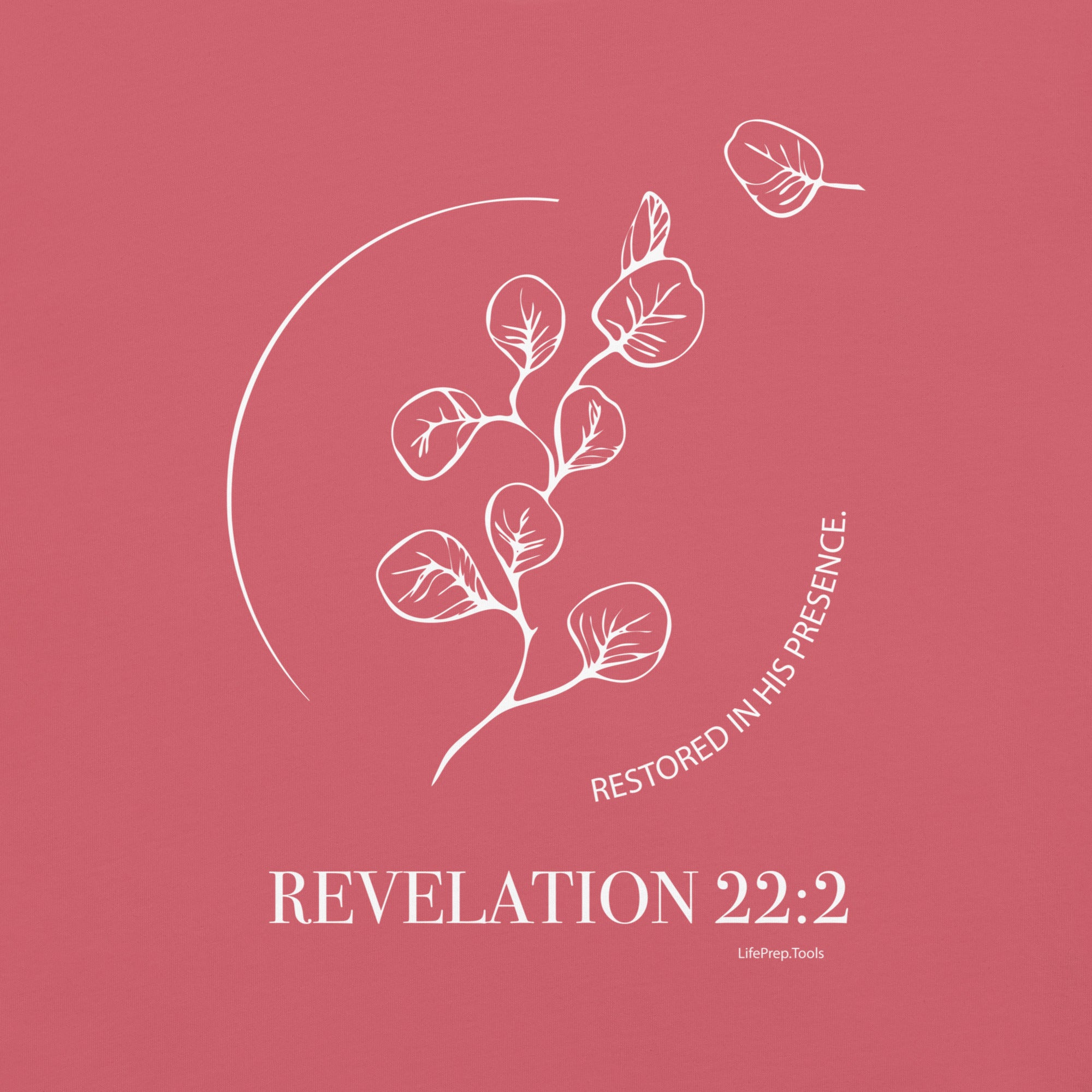 Carry a message of healing and renewal with this faith-inspired Comfort Colors tee featuring the words “Restored in His Presence” alongside Revelation 22:2.